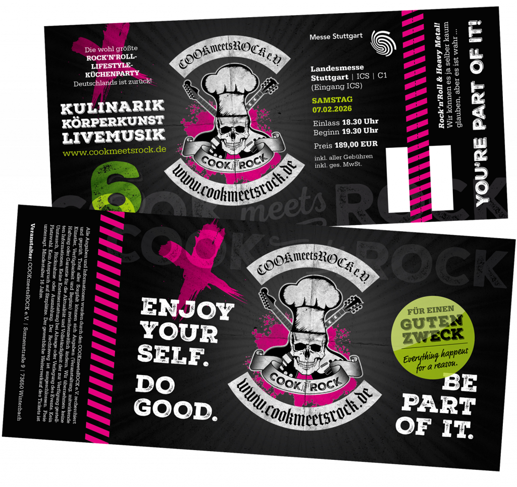 Karten bekommt ihr ganz einfach per E-Mail unter tickets(at)cookmeetsrock.de oder über untenstehendes Formular. Der Preis pro Karte beträgt 189,00 EUR (inkl. MwSt) zzgl. 5,90 EUR Versand.