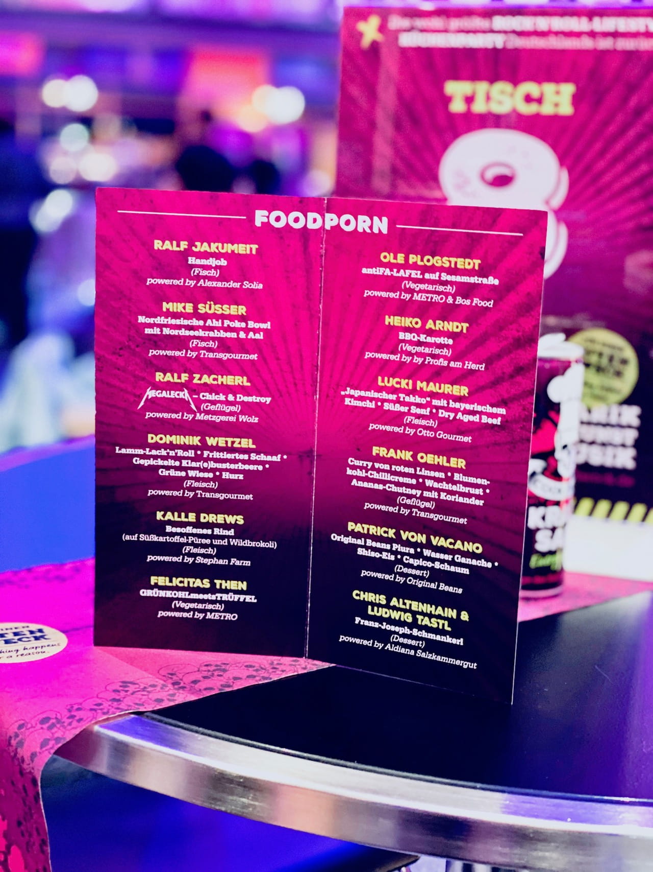 Die lukullischen Schwergewichte MIKE SÜSSER (Kabel1 „Mein Lokal – Dein Lokal), RALF JAKUMEIT (VOX „Perfektes Promi-Dinner“), DOMINIK WETZEL (ZDF „Fernsehgarten“), FELICITAS THEN (WELT „Die Foodtruckerin“), OLE PLOGSTEDT (RTL2 „Die Kochprofis“) und der „Fleisch-Papst“ LUDWIG MAURER (SAT1 „The Taste“) werden ebenfalls Konservatives, Durchgeknalltes, Experimentelles oder auch Traditionelles zubereiten.